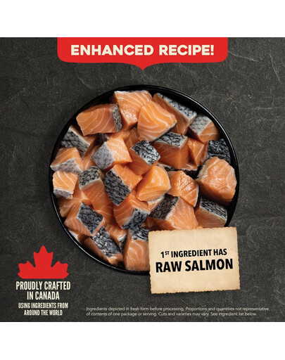 Saumon cru (22%), hareng déshydraté (19%), orge perlé, pois entiers, avoine décortiquée, graisse de porc (8%), avoine entière, fibre de pois chiche, huile de poisson (1%), carbonate de calcium, chlorure de potassium, varech séché, sel, racine de chicorée séchée, citrouille fraîche entière, citrouille musquée fraîche entière, carotte fraîche entière, pommes fraîches entières, poires fraîches entières, courgettes fraîches entières, chou frisé frais, épinards frais, feuilles de navet fraîches, feuilles de betterave fraîche, airelles rouges entières, myrtilles entières, amélanches entières, curcuma, chardon, racine de bardane, lavande, racine de valériane, cynorrhodon.