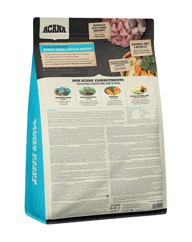 Viande de poulet fraîche (18%), poulet déshydraté (18%), lentilles rouges entières, pois verts entiers, organes de poulet frais (foie, cœur) (7%), graisse de poulet (7%), dinde déshydratée (4%), œufs (4%), Flets crus (4%), harengs déshydratés (4%), huile de poisson (3%), lentilles vertes entières, pois chiches entiers, pois jaunes entiers, fibres de pois, amidon de pois, foie de dinde cru (1%), sel, varech séché, potiron entier frais, pastèque entière fraîche, carottes entières fraîches, pommes entières fraîches, poires entières fraîches, courgettes entières fraîches, racine de radicchio séchée, chou frisé frais, épinards frais, feuilles de navet fraîches, feuilles de betterave fraîches, canneberges entières fraîches, myrtilles entières fraîches, amélanches entières fraîches, curcuma, chardon, racine de bardane, lavande, racine de valériane, églantine