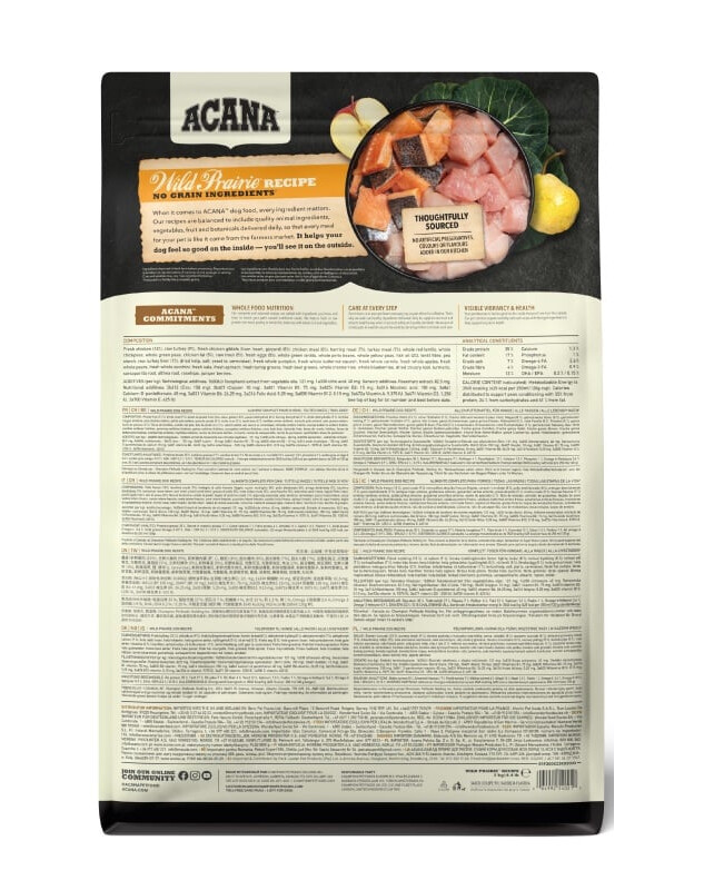 Viande de poulet fraîche (8%), viande de dinde fraîche (8%), abats de poulet frais (foie, cœur, reins) (8%), viande de poulet séchée (8%), viande de dinde séchée (8%), hareng séché (8%), pois verts entiers, lentilles rouges, pois chiches, oeufs entiers frais (4%), sandre frais (4%), truite de mer fraîche (4%), graisse de poulet (4%), abats frais de dinde (foie, coeur, rognons) (3%), lentilles vertes, haricots tachetés, pois jaunes entiers, luzerne séchée au soleil, huile de saumon (2%), fibres de lentilles, cartilage de poulet séché (1%), algues brunes, potiron frais, courge musquée fraîche, panais frais, chou frais, épinards frais, moutarde brune fraîche, feuilles de chou fraîches, carottes fraîches, pommes 'Red Delicious' fraîches, poires 'Bartlett' fraîches, foie lyophilisé (poulet et dinde) (0,1%), sel, canneberges fraîches, myrtilles fraîches, racine de chicorée, curcuma, chardon bénit, racine de bardane, lavande, racine de mauve véritable, églantier.