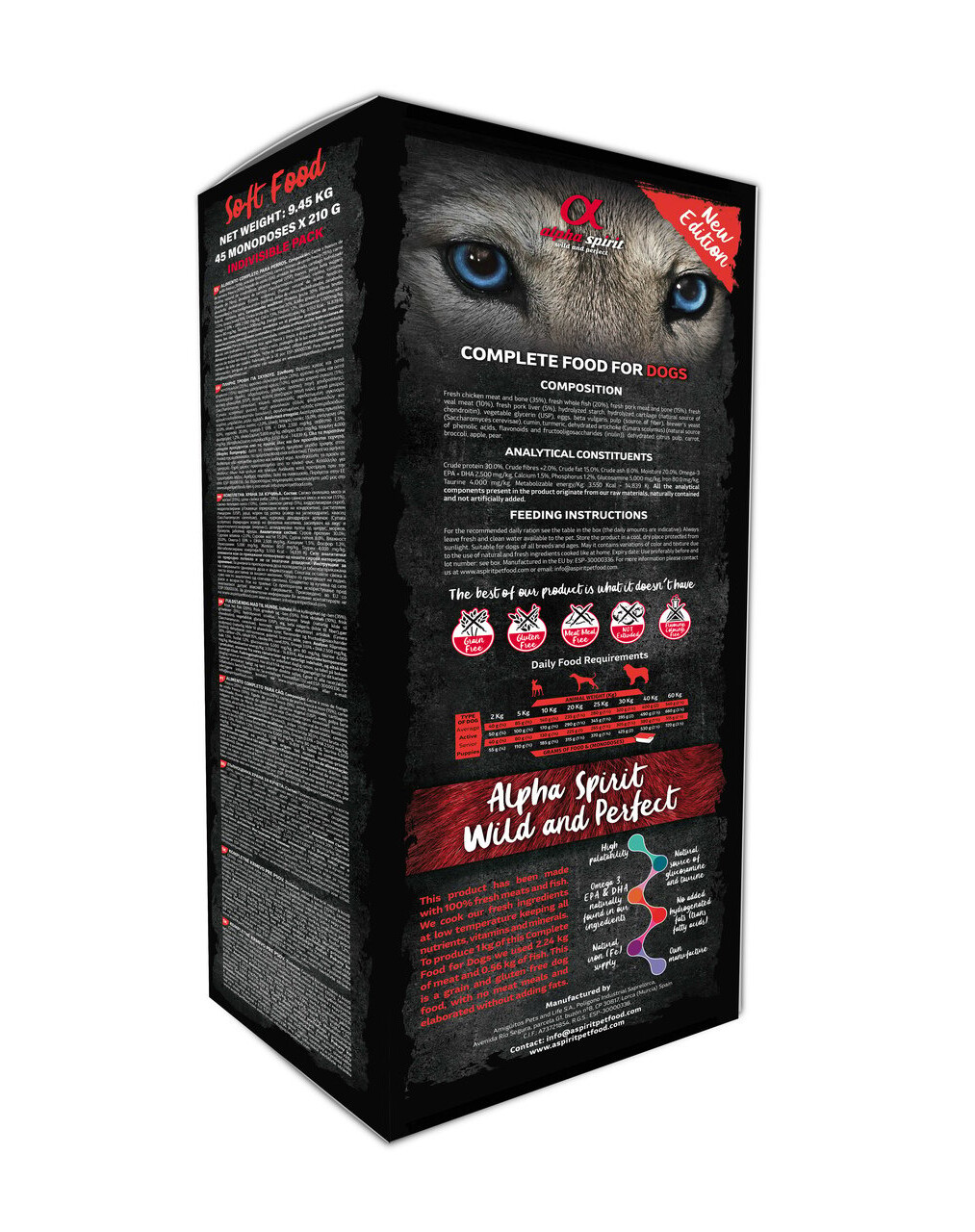 La recette est basée sur la viande et le poisson frais. Différents types de viande ont été utilisés dans l'alimentation dans des proportions différentes, comme la dinde, le porc, le canard. Les différents types de viande fournissent tous les ingrédients. Leurs différentes proportions correspondent aux besoins naturels et remontent aux racines de l'alimentation du chien. Des fruits et légumes frais et des herbes aromatiques sont ajoutés. La glucosamine et la chondroïtine soutiennent le système squelettique.