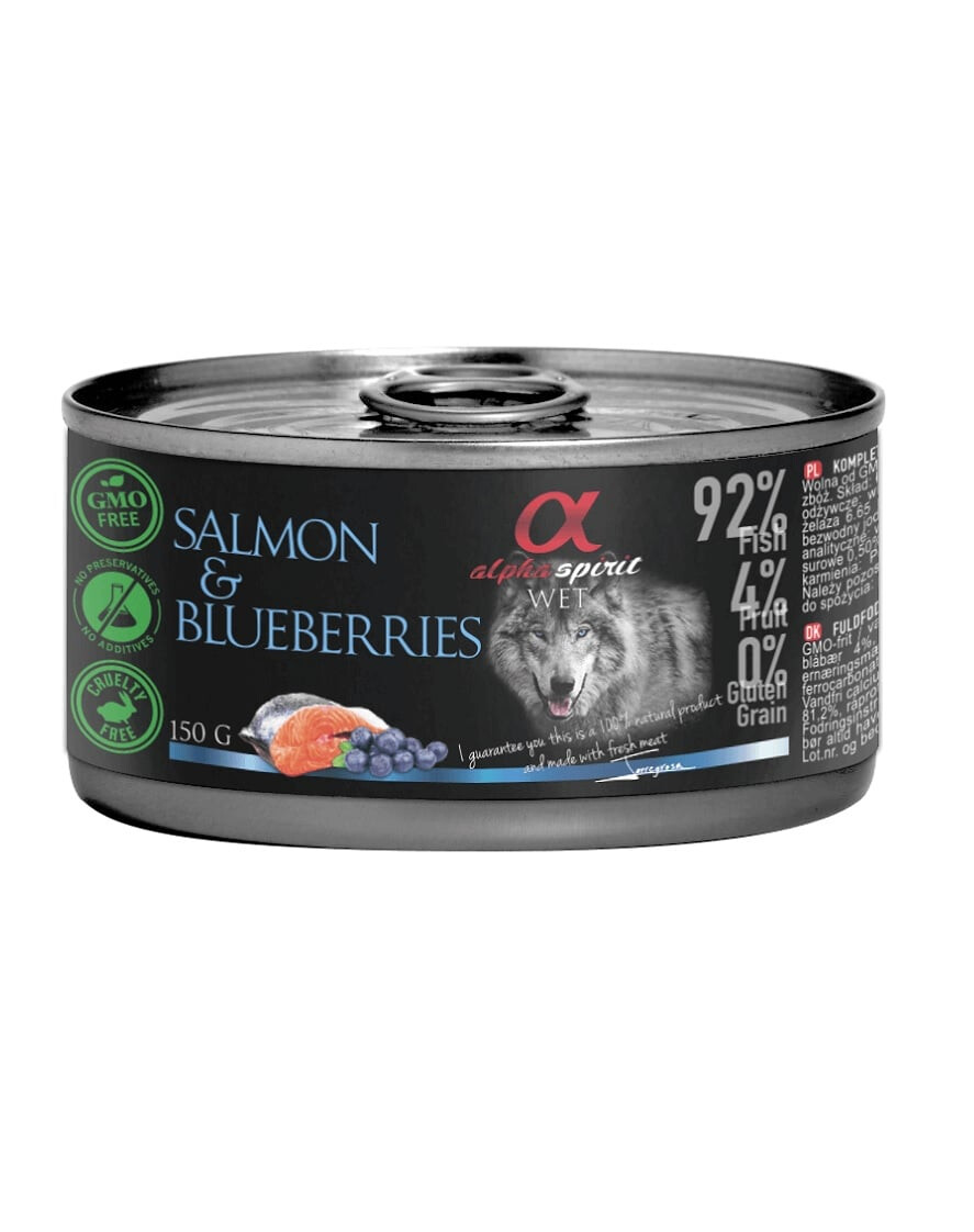 La recette est basée sur le saumon, un poisson au goût exceptionnel et au bon profil d'acides gras insaturés oméga-3 et -6, qui rendent le pelage brillant et velouté et la peau humide et douce. Les baies contiennent de nombreuses vitamines, dont la vitamine A, qui préserve la vue.