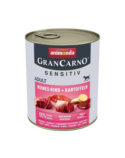 Animonda GranCarno Sensitive avec du bœuf et des pommes de terre, sans gluten. Nourriture humide pour tous les chiens adultes sensibles.