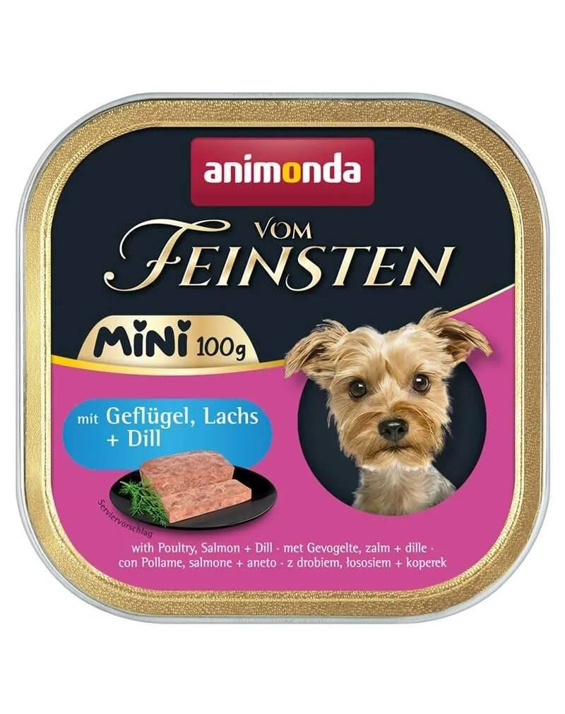 Animonda Vom Feinsten Mini au poulet, au saumon et à l’aneth est une nourriture complète en portion individuelle pratique, spécialement développée pour les chiens adultes de petites races. La recette soigneusement élaborée garantit une alimentation équilibrée et un goût raffiné qui procure un réel plaisir au chien à chaque repas.