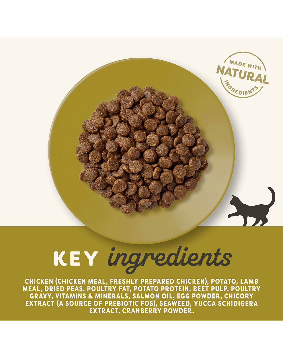 Contient 80 % d'ingrédients zoonotiques. La formule est à base de poulet et d'agneau. En tant que carnivores, les chats ne tolèrent pas les quantités excessives d'additifs dans leur nourriture. L'absence de céréales ne surcharge pas le système digestif des chats et ces aliments sont mieux utilisés par l'organisme félin.