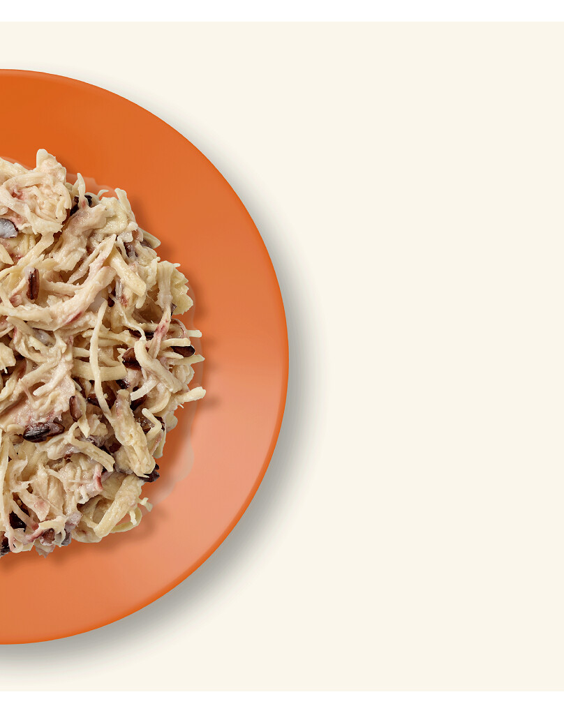 Poulet 50%, Bouillon de poulet 23%, Citrouille 25%, Riz 2%.