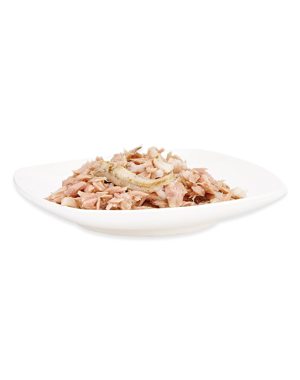 Filet de thon : 60%, bouillon de poisson : 24%, anchois : 5%, algues : 5%, riz : 2%.