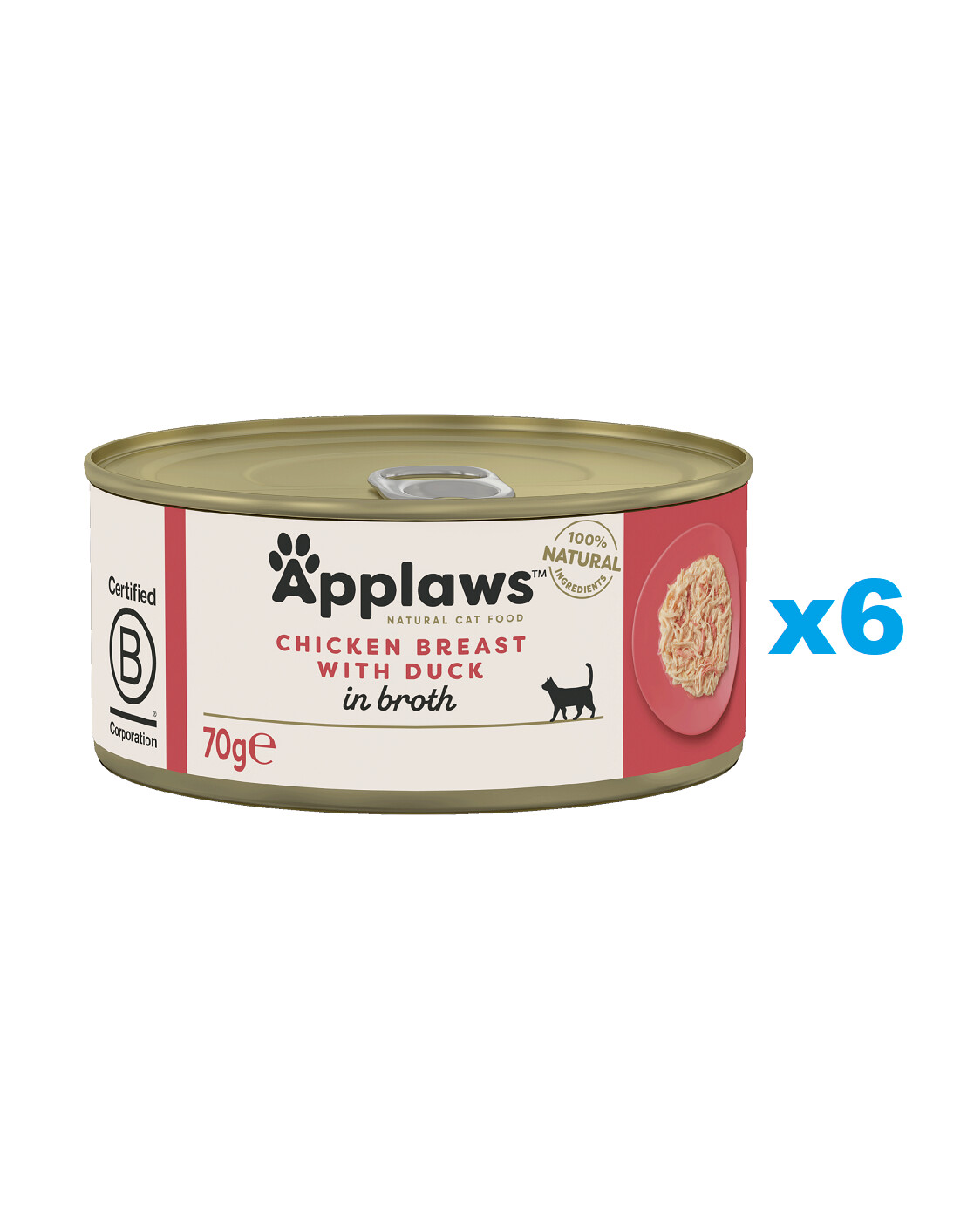 Blanc de poulet 70%, Canard 5%, Riz 1%, Bouillon de poulet 24%. Sans additifs.