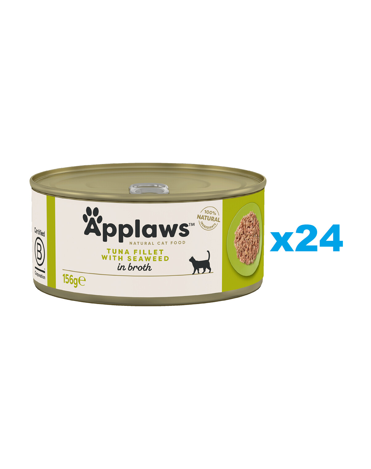 Filet de thon 70%, Riz 1%, Algues 5%, Bouillon de poisson 24%. Sans additifs.