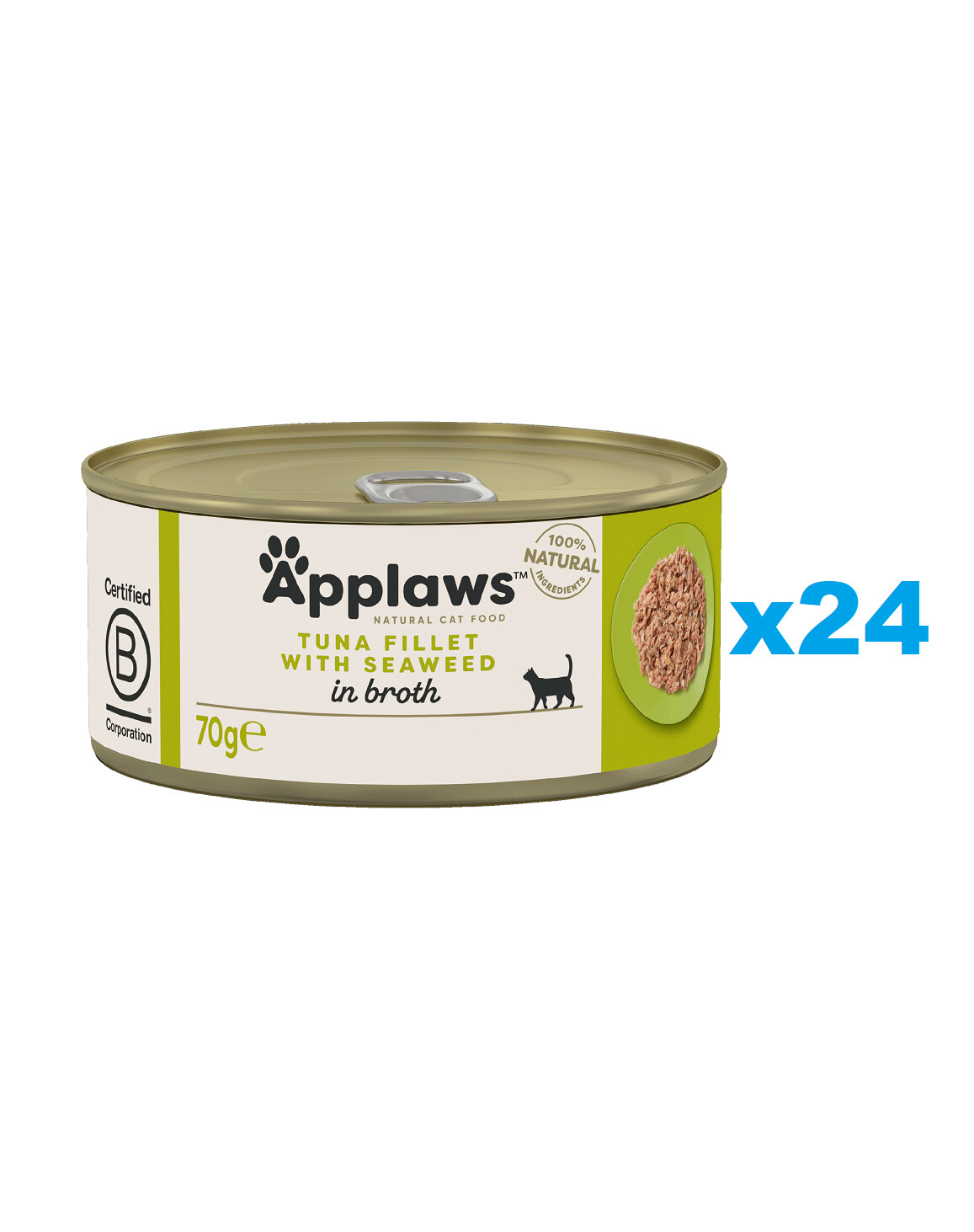 Filet de thon 70%, Riz 1%, Algues 5%, Bouillon de poisson 24%. Sans additifs.