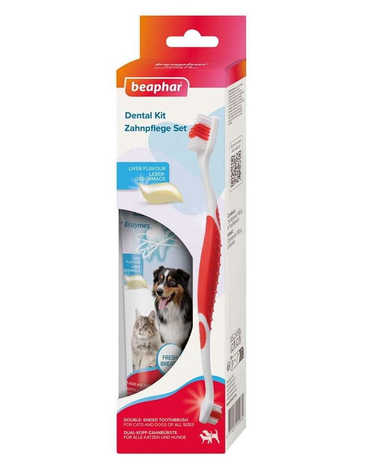 Prenez soin des dents propres et de l'haleine fraîche de votre animal avec un ensemble complet d'hygiène buccale pour chiens et chats, comprenant une brosse à dents et un dentifrice.