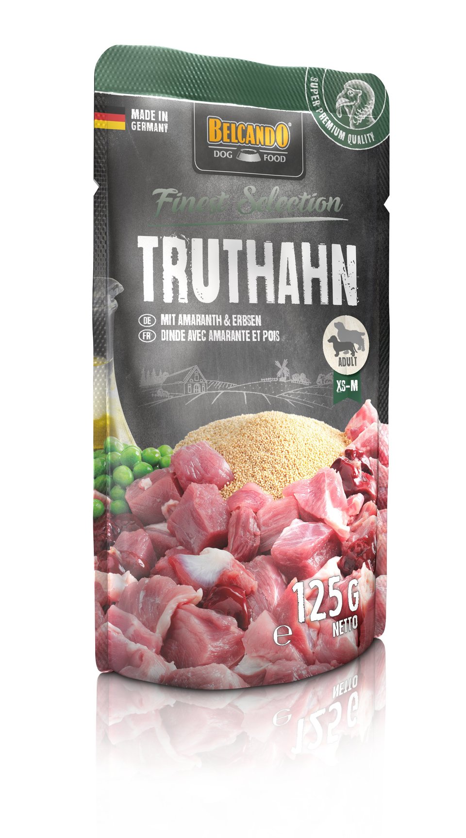 Viande de dinde, cœurs, foies et gésiers (63%) ; Bouillon de viande de dinde (26,5%) ; Amarante, cuite (5%) ; Pois (4%) ; Huile de carthame (0,5%) ; Oeufs séchés (0,5%) ; Minéraux (0,5%).