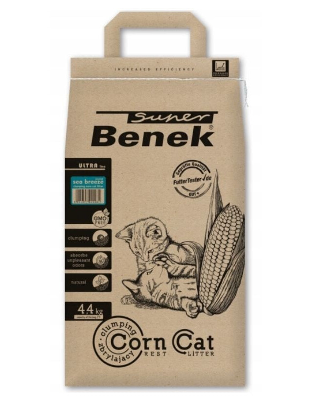 Litière pour chats Super Benek à base de maïs, agglomérante.