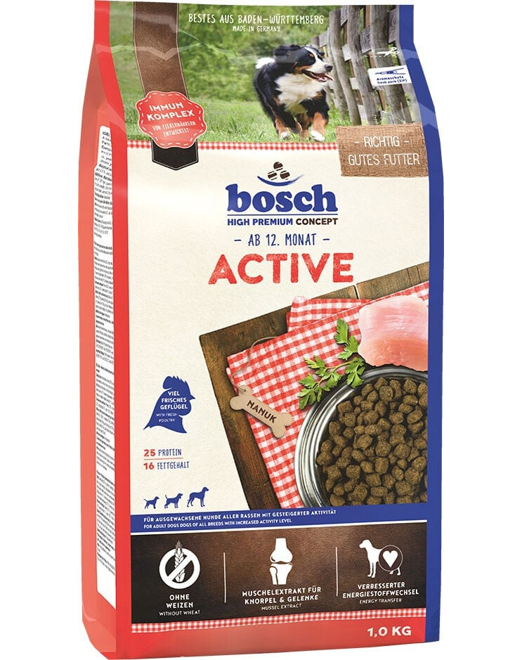 Aliment sec et complet pour les chiens adultes physiquement actifs. Également recommandé pour les jeunes chiens qui ont atteint l'âge adulte, mais qui sont très actifs et en train de développer leur musculature. En plus d'une dose optimale de protéines animales facilement digestibles, ACTIVE contient un niveau adéquat de matières grasses (16 %), dont les acides gras insaturés essentiels oméga 3 et oméga 6. Il s'agit d'un aliment dédié aux chiens qui doivent être particulièrement performants, dans le sport et le jeu, ainsi que dans les fonctions de garde et de protection. Active est aussi particulièrement populaire dans les chenils.