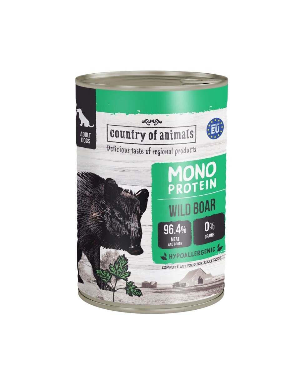 Nourriture humide monoprotein Country of Animals est plus qu'un simple repas quotidien pour votre animal. C'est un véritable festin où le goût exceptionnel s'allie à une composition unique et saine, prenant soin de la santé et du système digestif délicat du chien.
