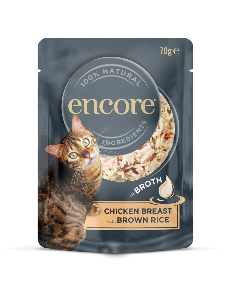 Encore Cat Chicken Breast with Brown Rice in Broth est une nourriture complémentaire naturelle, sans céréales (dans le sens sans céréales typiques comme le blé, le maïs – bien qu'elle contienne du riz brun) pour les chats adultes. La recette est basée sur une haute teneur en viande de poitrine de poulet et l'ajout de riz brun dans un bouillon léger, ce qui assure une appétence, une digestibilité et soutient l'hydratation.