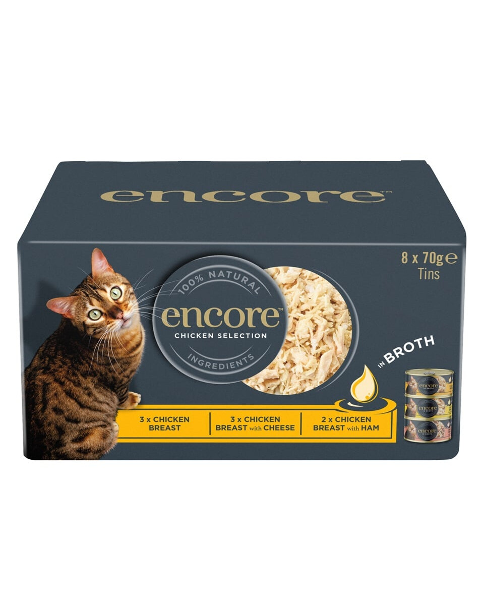 Nourriture complémentaire naturelle, sans céréales pour les chats adultes. Ce pack de 8 sachets × 70 g offre un mélange de différentes saveurs à base de poitrines de poulet de la plus haute qualité, immergées dans un bouillon léger. La recette de la marque ENCORE se distingue par sa composition simple, l'absence d'additifs inutiles et une forte teneur en viande – idéale pour les chats qui nécessitent de la variété dans leur alimentation ou qui ont un système digestif sensible.