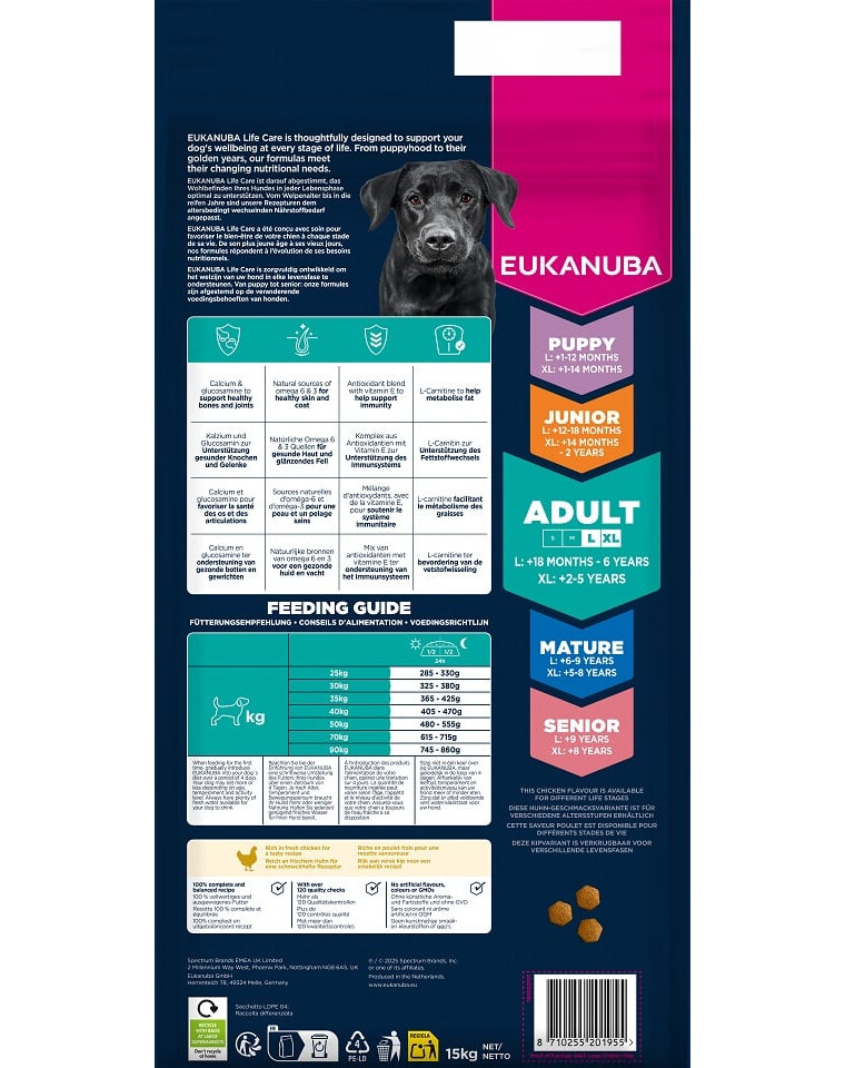 EUKANUBA Life Care est une gamme de nourritures premium, créée sur la base de recherches scientifiques, pour soutenir les besoins des chiens à chaque étape de leur vie. La variante Adult Large Breeds Chicken a été développée pour les chiens adultes de grandes races âgés de 18 mois à 6 ans et pour les chiens de races géantes âgés de 2 à 5 ans.