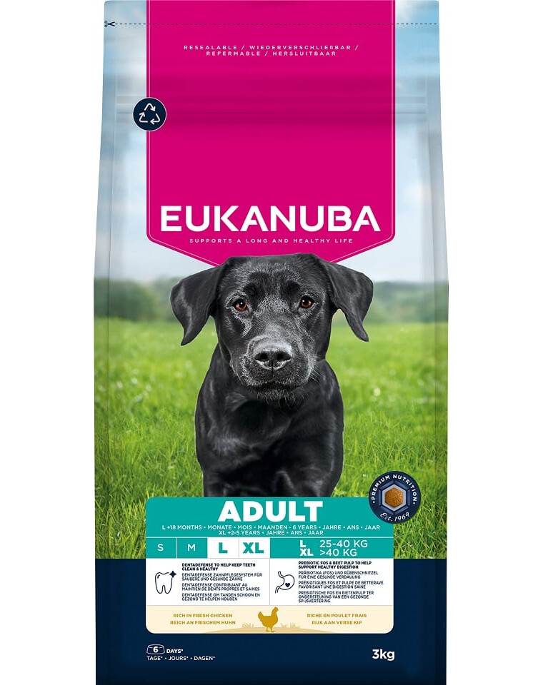 Nourriture sèche EUKANUBA pour chiens adultes, riche en poulet frais, est 100% complète et équilibrée et idéale pour les grandes races âgées de 18 mois à 6 ans (ou 2 à 5 ans pour les races géantes).