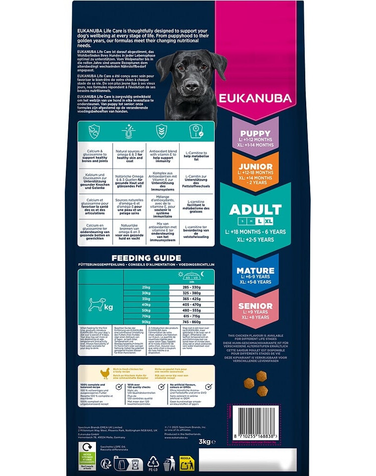 EUKANUBA Life Care est une gamme de nourritures premium développée sur la base de recherches scientifiques pour répondre précisément aux besoins des chiens à chaque étape de leur vie. Cette formule a été spécialement conçue pour les chiens adultes de grandes races âgés de 18 mois à 6 ans (et pour les races géantes de 2 à 5 ans), qui nécessitent un régime soutenant des muscles forts, des articulations saines et le maintien d'un poids optimal.