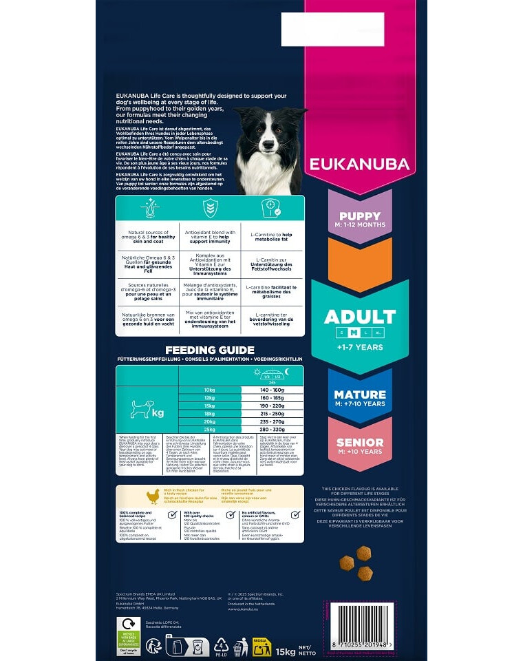 La gamme EUKANUBA Life Care propose des aliments premium, développés sur la base de recherches scientifiques, pour répondre au mieux aux besoins des chiens de tous âges. La variante Adult Medium Breeds Chicken a été créée pour les chiens adultes de races moyennes âgés de 1 à 7 ans.