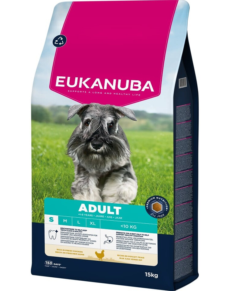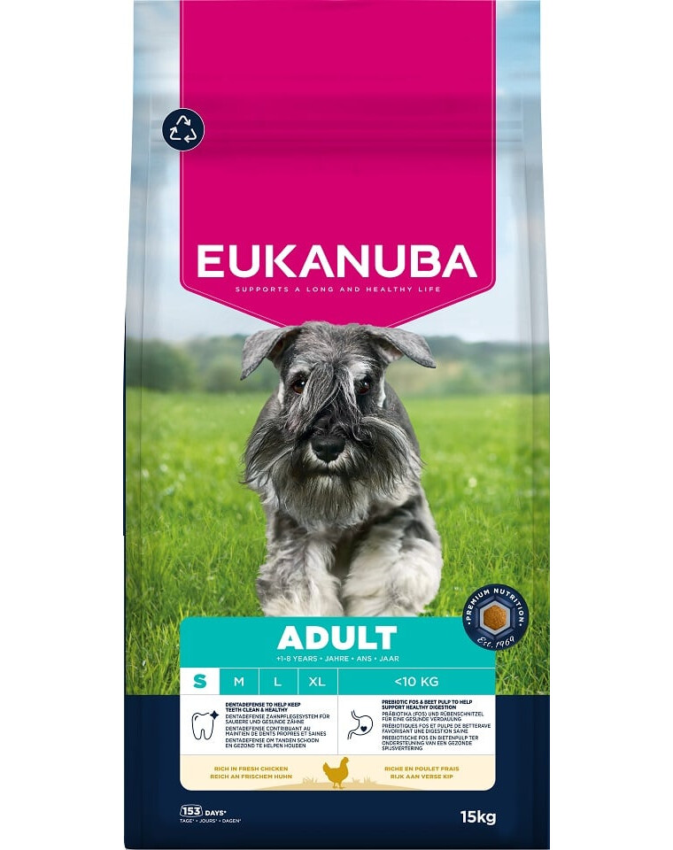 Nourriture sèche EUKANUBA pour chiens adultes, riche en poulet frais, est 100% complète et équilibrée et idéale pour les petites races âgées de 1 à 8 ans.