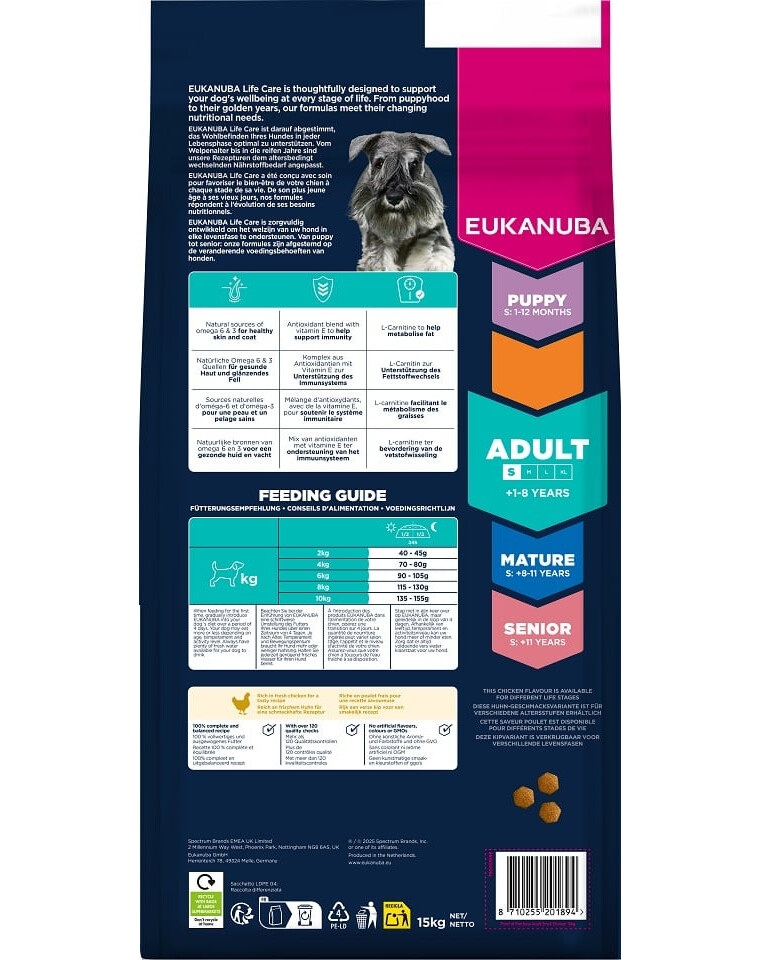 Les chiens adultes de petites races sont pleins d'énergie et nécessitent un régime qui répond à leurs besoins quotidiens. EUKANUBA Life Care a été développée par des experts pour soutenir leur santé et leur vitalité – chaque jour. Cette recette à base de poulet frais fournit des protéines de haute qualité qui favorisent des muscles forts et une excellente condition physique pour votre compagnon.