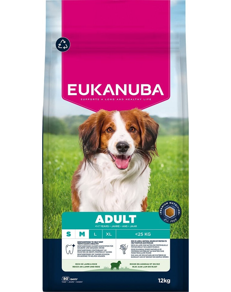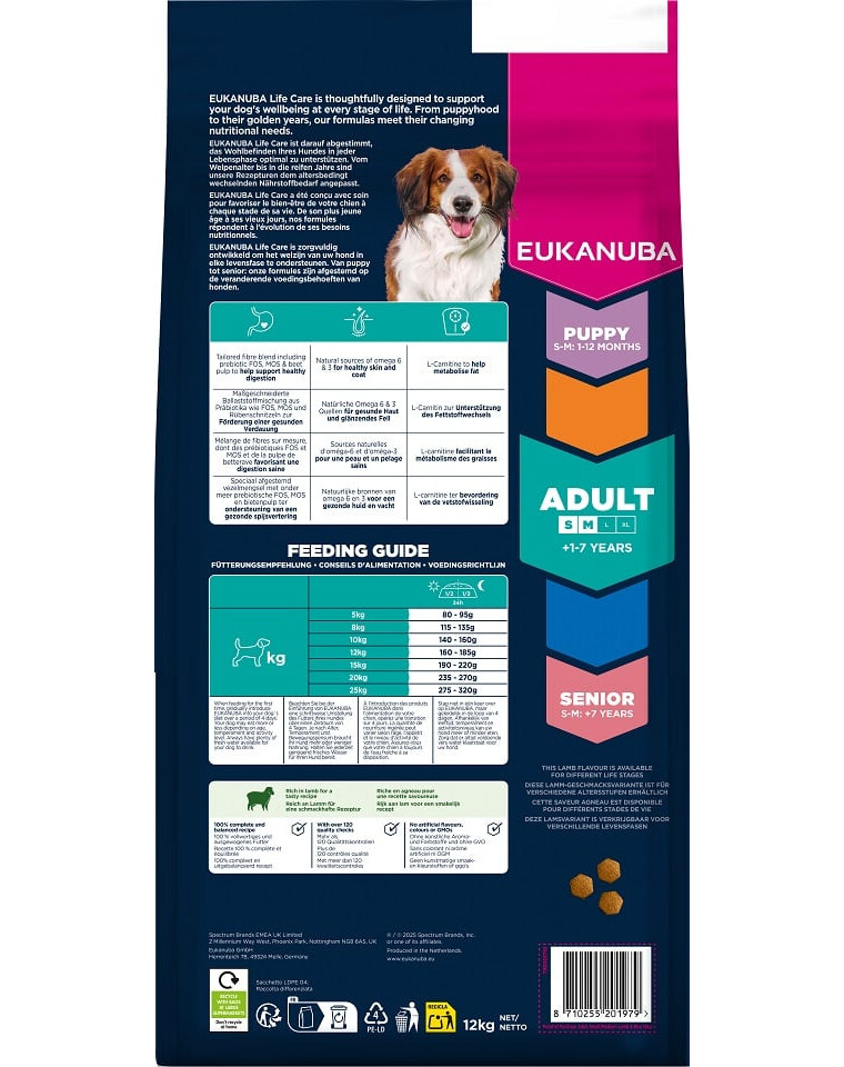 EUKANUBA Life Care est une gamme de nourritures premium, développée sur la base de recherches scientifiques, pour soutenir les besoins des chiens à chaque étape de leur vie. La variante Adult Small & Medium Breeds Lamb & Rice a été créée pour les chiens adultes de races petites et moyennes âgés de 1 à 7 ans.