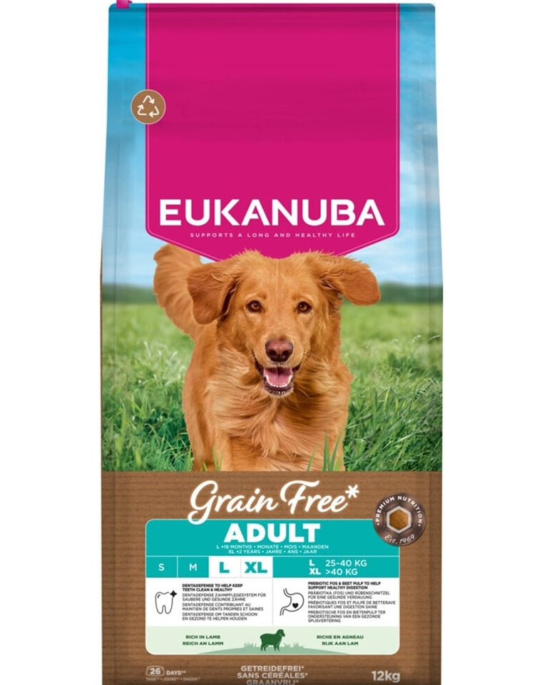 EUKANUBA Grain Free Adult Large Lamb est une nourriture sèche complète et sans céréales, spécialement formulée pour les chiens adultes de grandes races. La recette a été adaptée à leurs besoins nutritionnels spécifiques, soutenant une condition physique optimale, la santé du système digestif ainsi que des os et des dents solides.