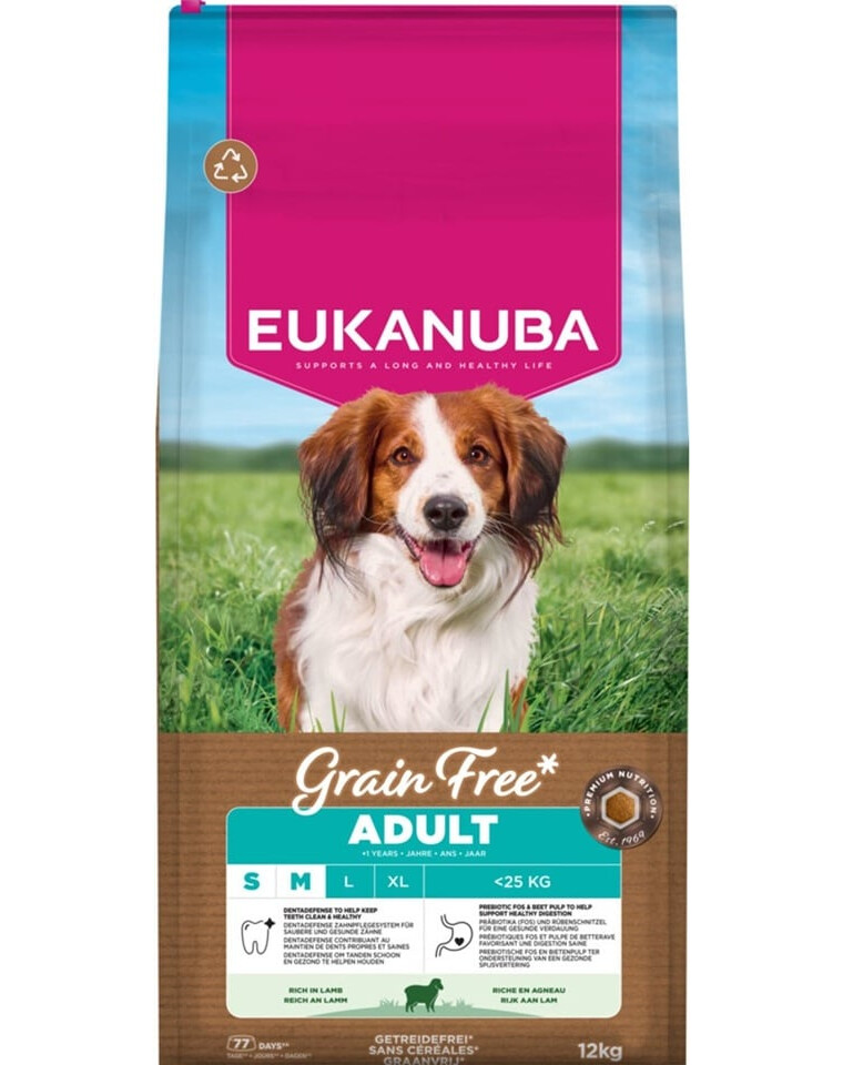 EUKANUBA Grain Free Adult Small & Medium Lamb est une alimentation complète, sans céréales, destinée aux chiens adultes de petites et moyennes races âgés de plus d'un an. La recette à faible teneur en allergènes a été développée pour les chiens ayant un système digestif sensible et des tendances à l'intolérance aux céréales, soutenant leur condition quotidienne et leur bien-être.