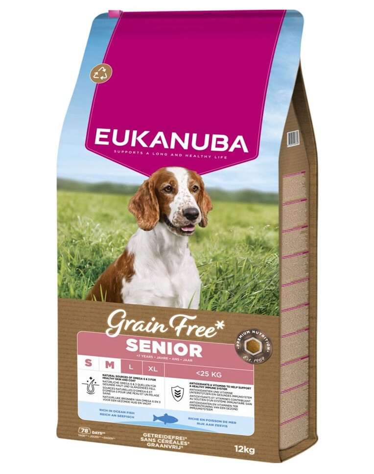 Nourriture sèche sans céréales destinée aux chiens âgés de petites et moyennes races. Formule à base de poissons océaniques — source de protéines et d'acides gras Omega-3 facilement digestibles et hautement assimilables, soutenant la peau, le pelage, les articulations et la condition générale des seniors.