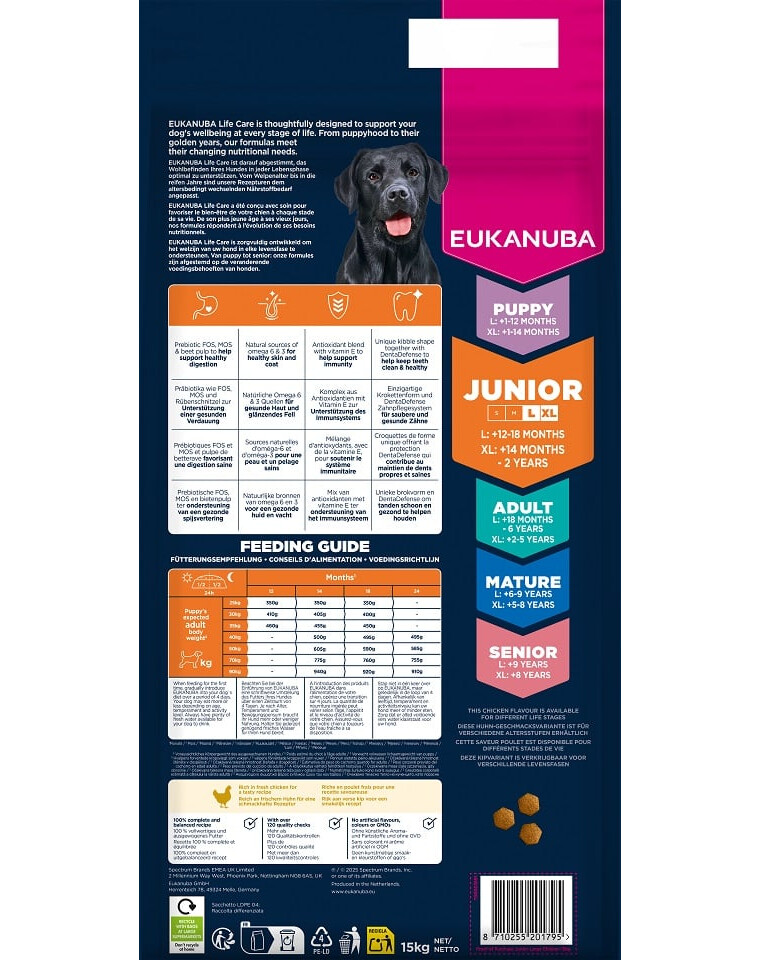 EUKANUBA Life Care est une gamme de nourritures premium développée sur la base de recherches scientifiques, pour répondre pleinement aux besoins changeants du corps du chien à chaque étape de sa vie. Cette formule a été spécialement conçue pour les jeunes chiens de grandes races âgés de 12 à 18 mois (ou 14 mois à 2 ans pour les races géantes), période durant laquelle le développement du squelette et des muscles est encore en cours, tout en entrant lentement dans l'âge adulte.