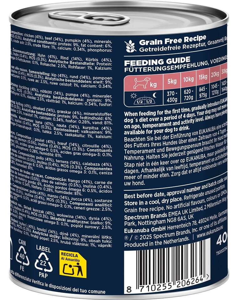 La nourriture se présente sous forme de pâté grossier avec des morceaux visibles de viande et de légumes, ce qui assure un goût attrayant et une consistance satisfaisante. Le produit est exempt de colorants, d'arômes et de conservateurs artificiels. Il peut être donné seul ou en combinaison avec la nourriture sèche EUKANUBA, créant ainsi un repas complet et nutritif adapté aux besoins des chiens âgés.