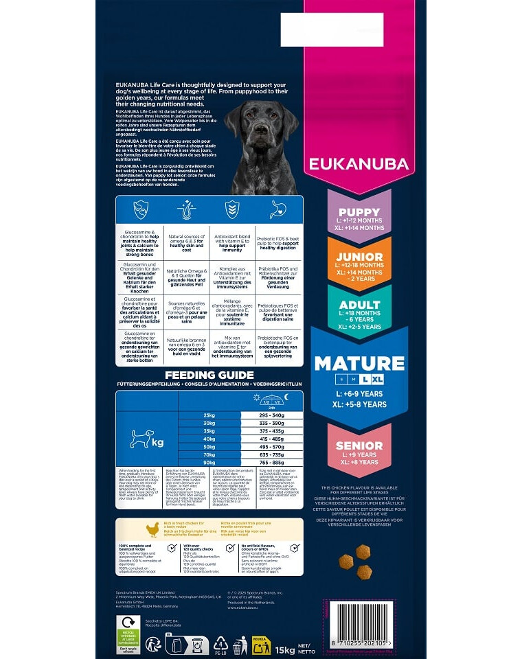 EUKANUBA Life Care est une gamme de nourritures premium, développée sur la base de recherches scientifiques, qui répond aux besoins des chiens à chaque étape de leur vie. Cette nourriture a été spécialement formulée pour les chiens matures de grandes races âgés de 6 à 9 ans (pour les races géantes : 5 à 8 ans), fournissant des protéines de haute qualité provenant de poulet frais ainsi que des ingrédients complets soutenant un vieillissement sain et la vitalité.