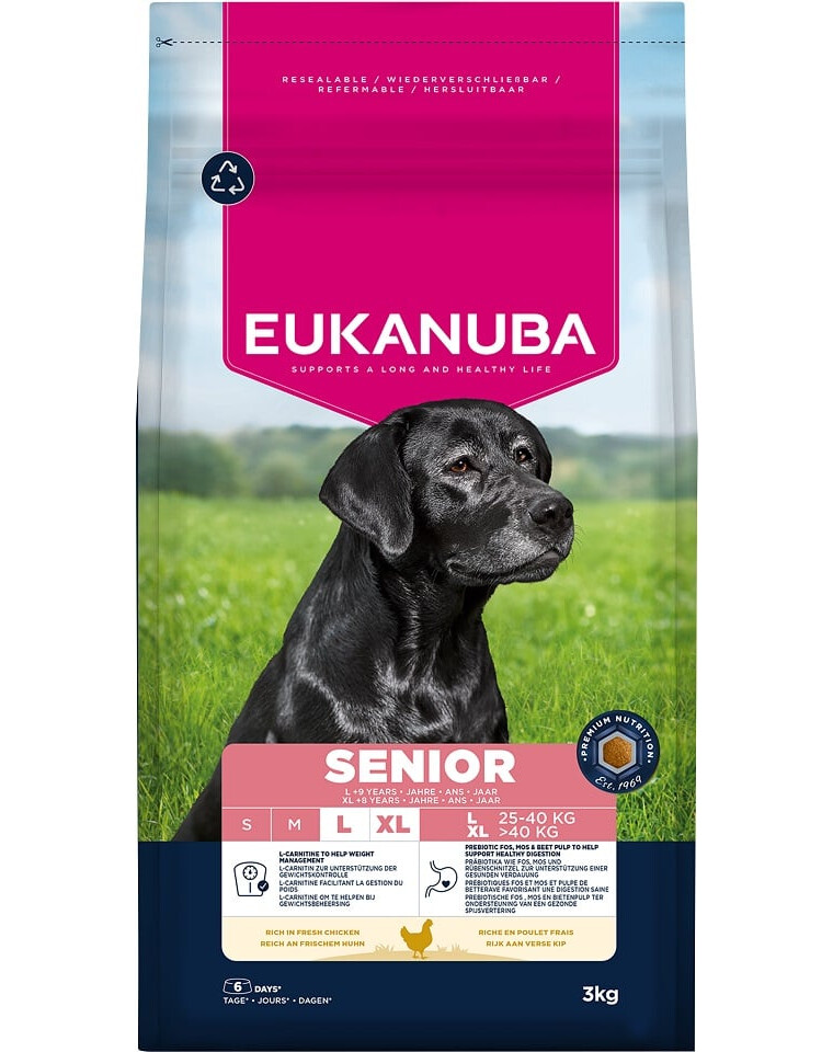 Nourriture sèche EUKANUBA pour chiens âgés, riche en poulet frais, est 100% complète et équilibrée et idéale pour les grandes races de plus de 9 ans (ou plus de 8 ans pour les races géantes).