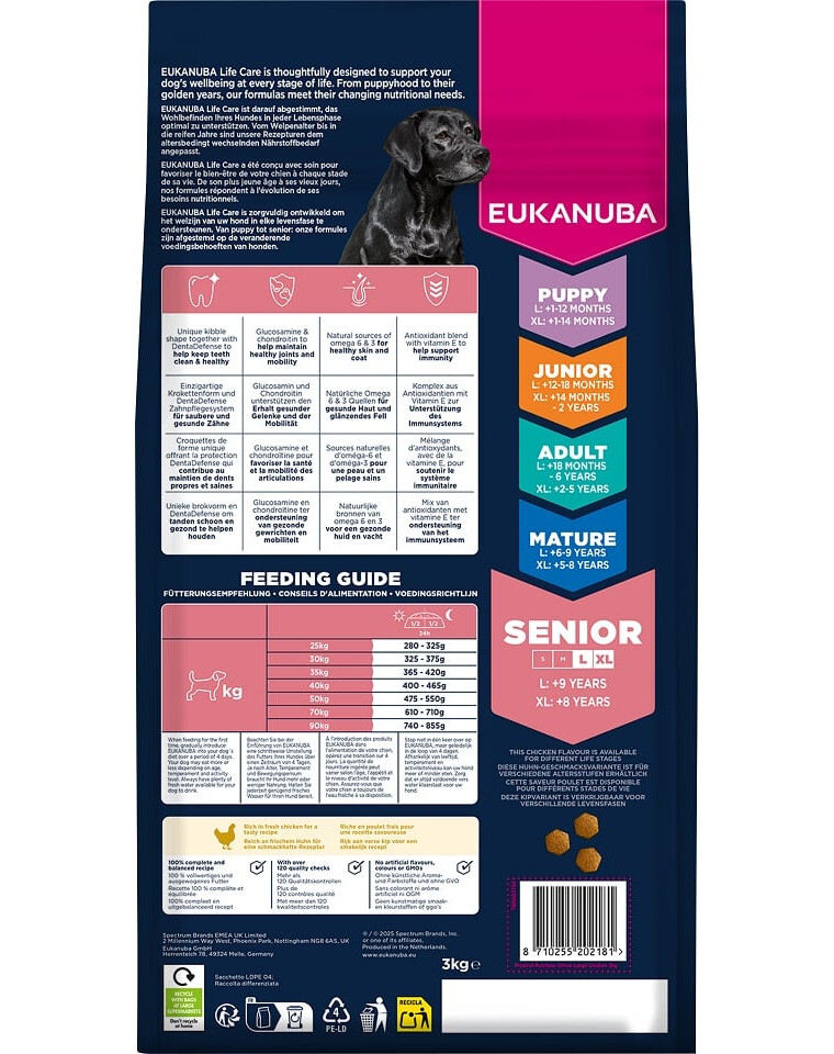 EUKANUBA Life Care est une gamme de nourritures premium développée sur la base de recherches scientifiques, soutenant les besoins nutritionnels changeants des chiens à chaque étape de leur vie. La formule dédiée aux chiens âgés de grandes races (y compris les géants) contient du poulet frais de haute qualité, qui fournit des protéines soutenant le maintien de la masse musculaire et une condition optimale.