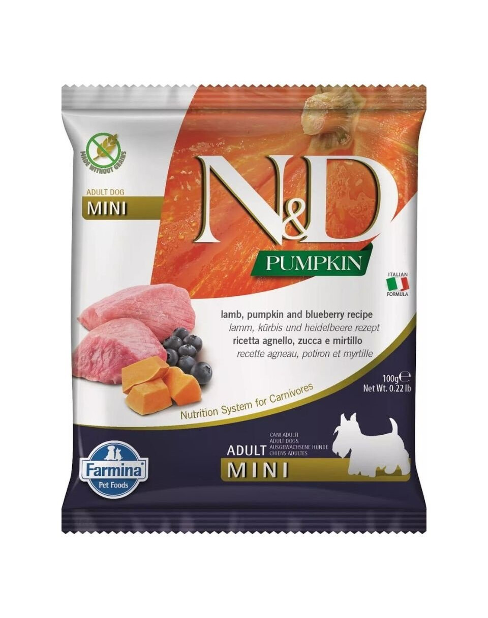Nourriture complète pour chiens adultes de petites races avec agneau, potiron et myrtille.