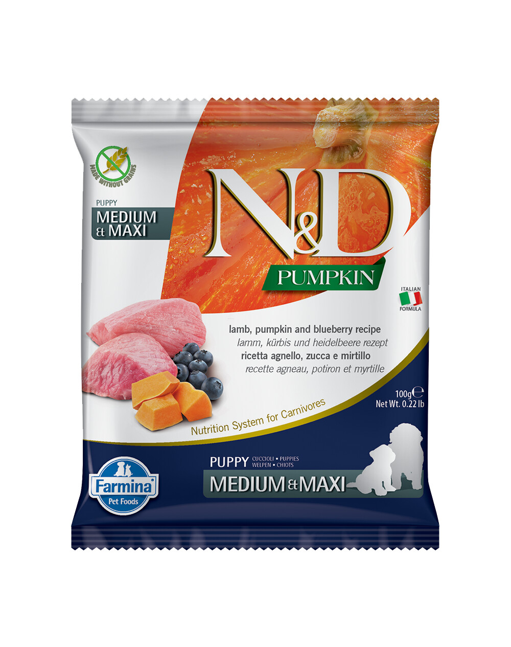 Nourriture complète pour chiots et chiennes en gestation ou en lactation avec agneau, potiron et myrtille.