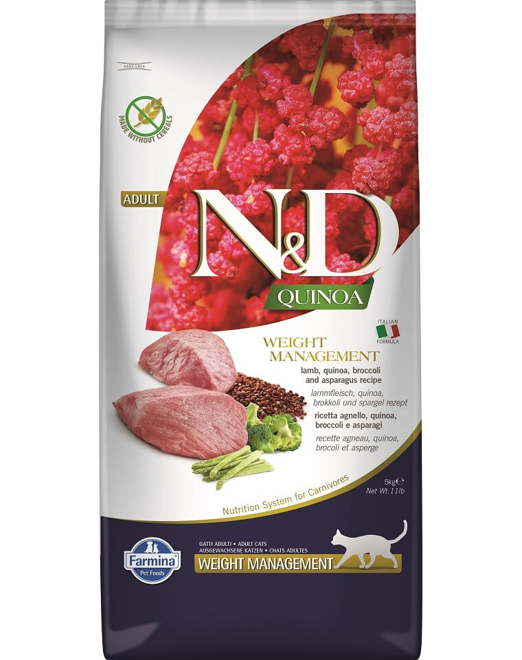 Farmina N&D Quinoa Weight Management est une nourriture diététique complète pour chats recommandée pour réduire le poids corporel excessif.