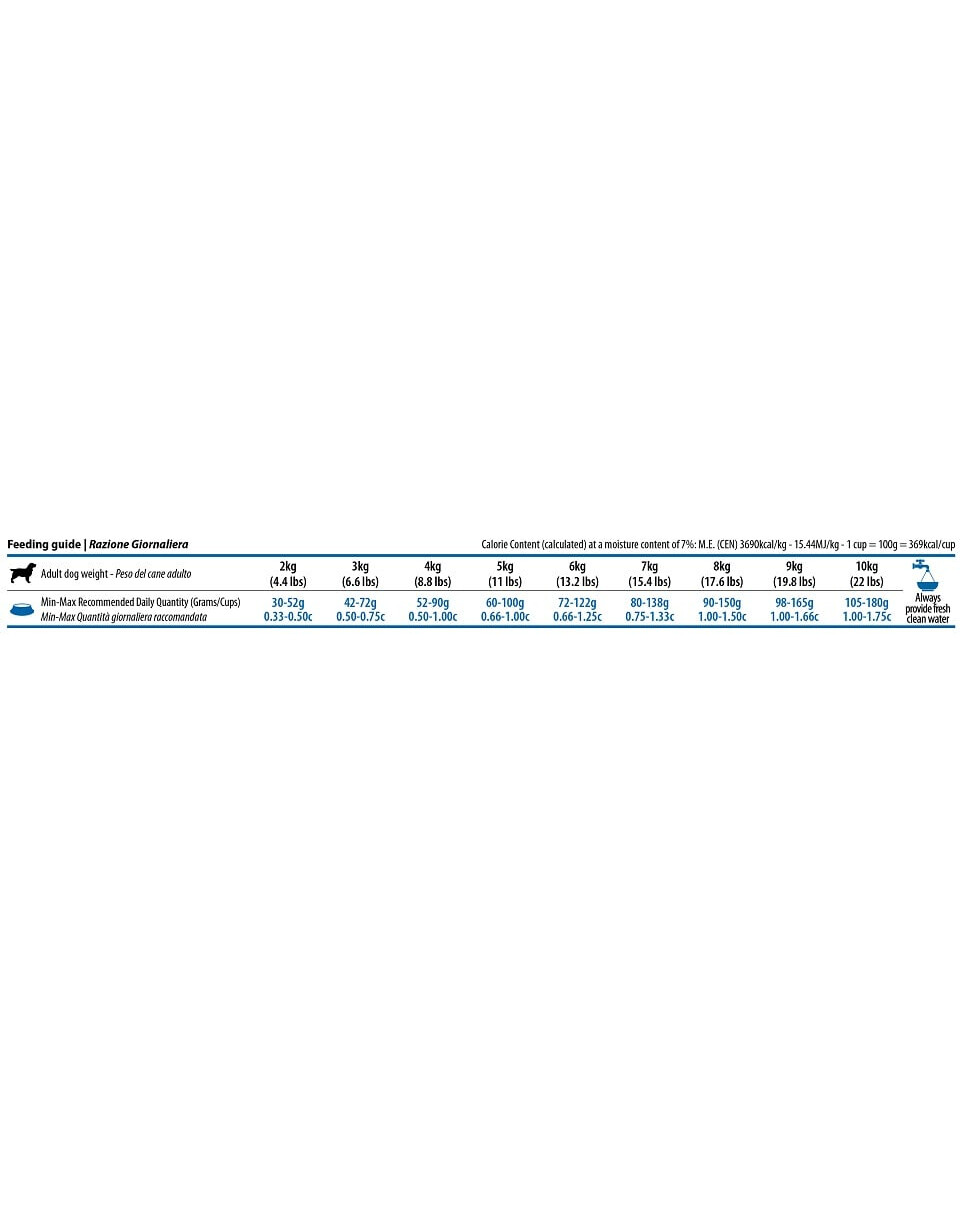 Protéines brutes 23,00% ; Graisses brutes 12,00% ; Fibres brutes 2,80% ; Humidité 9,00% ; Cendres brutes 7,20% ; Calcium 1,00% ; Phosphore 0,80% ; Acides gras oméga-6 2,20% ; Acides gras oméga-3 0,40% ; DHA 0,12% ; EPA 0,10% ; Glucosamine 1200mg/kg ; Sulfate de chondroïtine 900mg/kg.