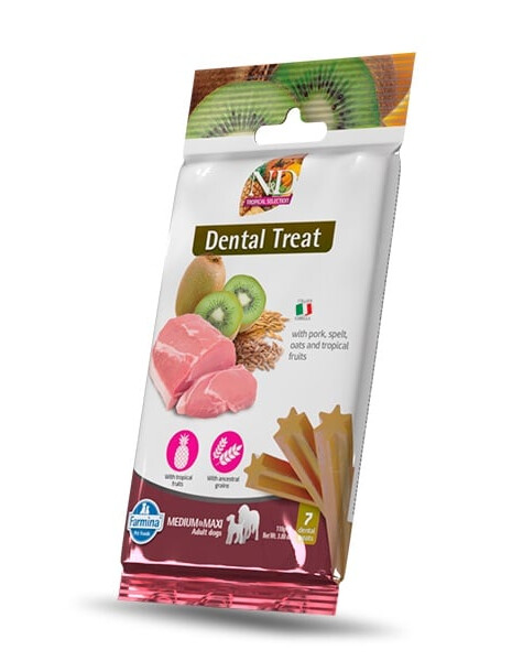 Farmina N&D Tropical Selection est une friandise dentaire pour les chiens de taille moyenne et grande à partir de 4 mois, qui combine des ingrédients naturels et un soutien fonctionnel pour la santé.