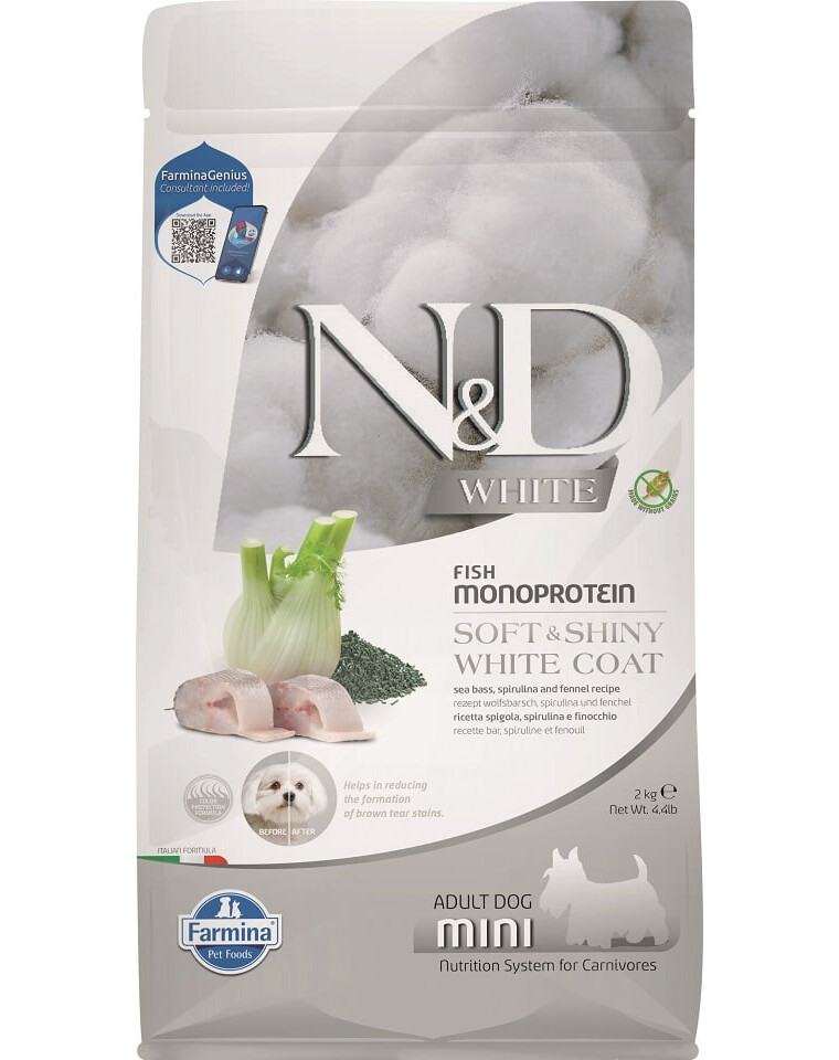 Nourriture complète pour chiens adultes de petites races au pelage blanc avec du bar, de la spiruline et du fenouil.