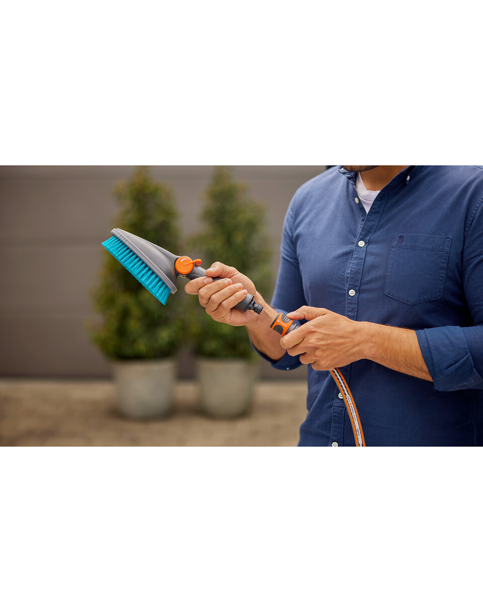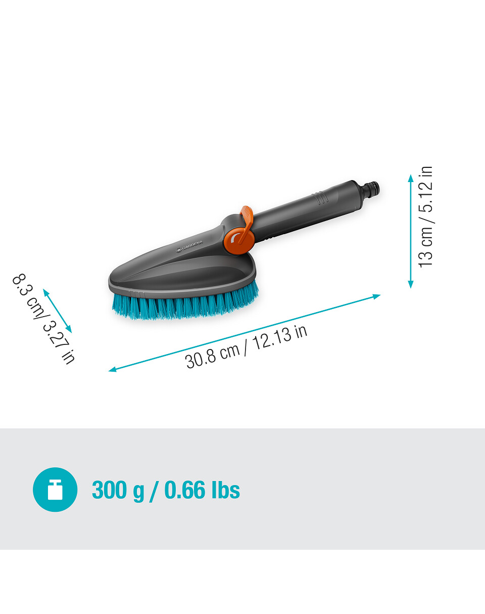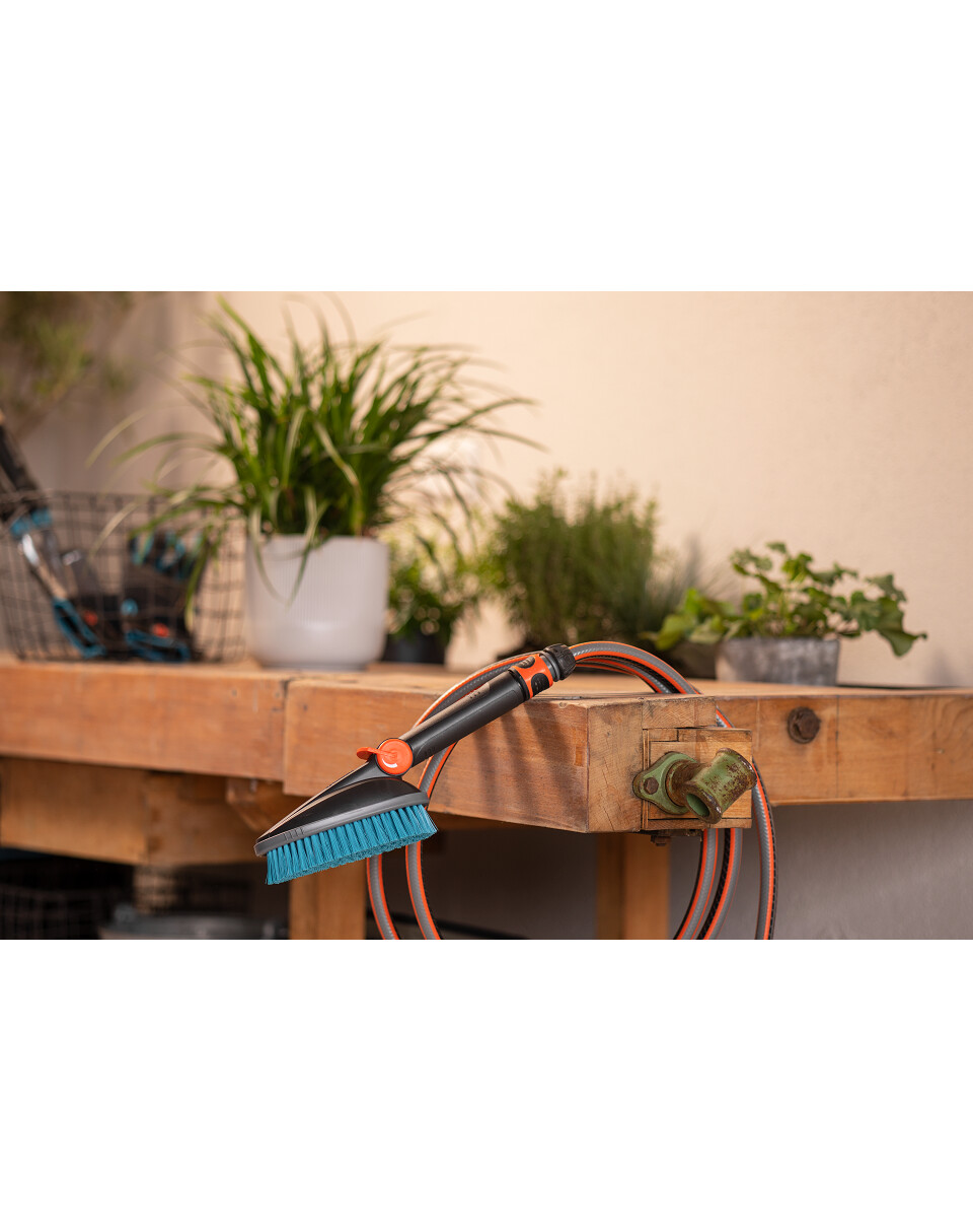 Le porte-savon GARDENA permet un nettoyage plus approfondi. Il suffit d'insérer le porte-savon dans la brosse, de raccorder la brosse au tuyau d'arrosage et le savon est automatiquement ajouté à l'eau. Il n'est donc plus nécessaire de mélanger de l'eau avec des produits de nettoyage spéciaux, ce qui demande beaucoup de travail, et vous pouvez utiliser la brosse pour appliquer le mélange eau-savon directement sur la surface à nettoyer. La brosse et le porte-savon constituent l'ensemble idéal pour le nettoyage des brouettes et des surfaces similaires.