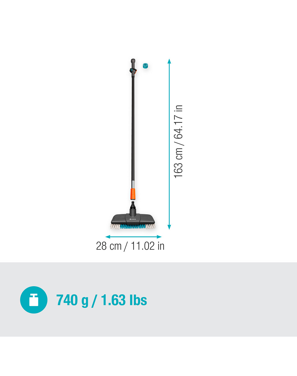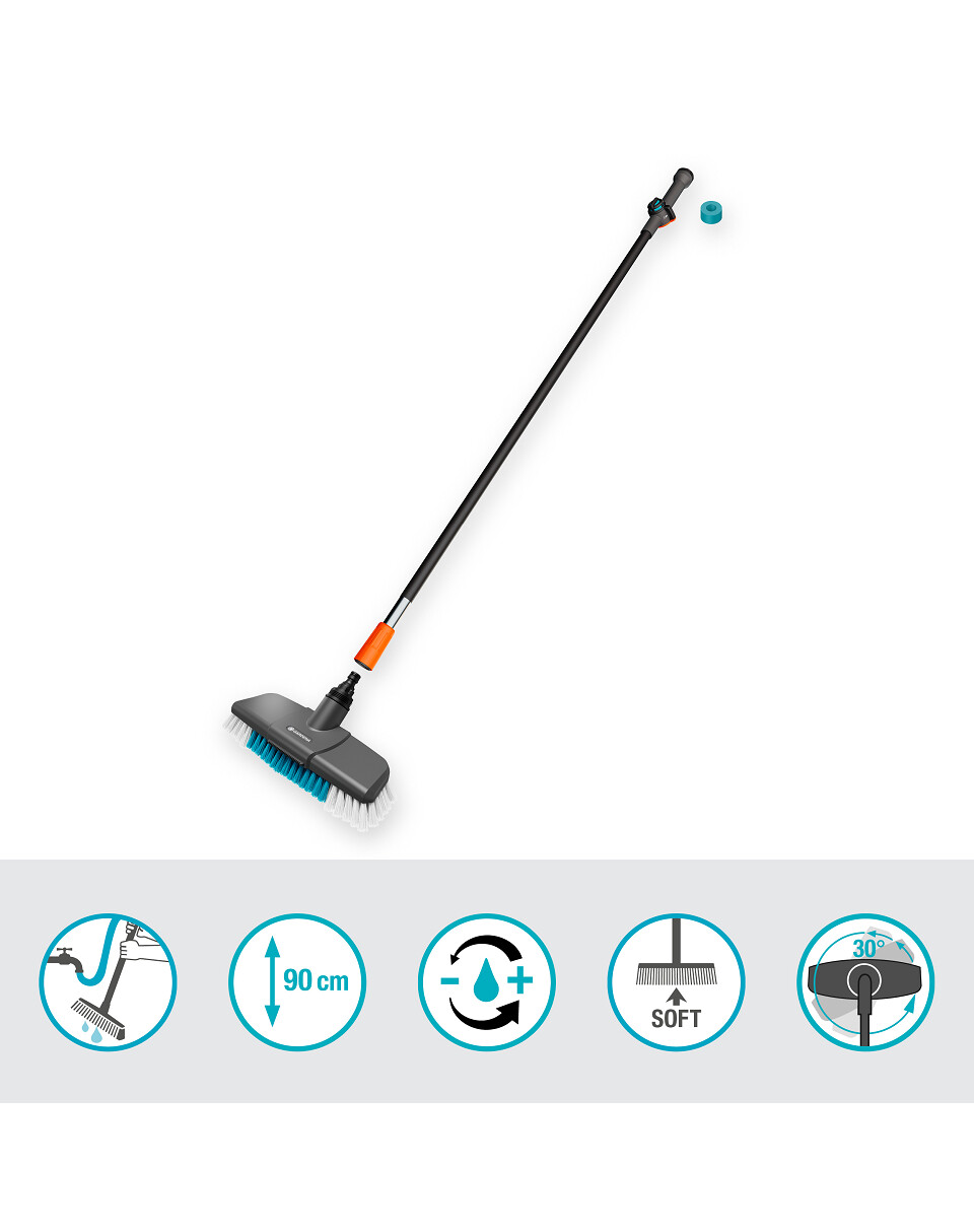 La combinaison de la brosse, du manche et du shampoing permet de nettoyer efficacement et en profondeur les grandes surfaces extérieures. Les surfaces délicates telles que les vérandas, les toits de terrasse et les jardins d'hiver retrouveront un aspect neuf grâce à ce kit de nettoyage. Le manche se fixe au tuyau d'arrosage par un simple "clic" et la brosse se fixe au manche par une vis. Le shampooing est contenu dans un distributeur placé directement sur la tige.