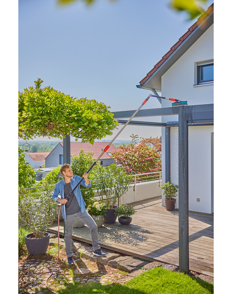 Le manche Flex peut être facilement raccordé au tuyau d'arrosage à l'aide du connecteur original du système GARDENA. Cela permet un nettoyage efficace, car l'eau est dirigée à travers le manche directement sur la brosse, atteignant exactement l'endroit où elle est nécessaire. Il est ainsi plus facile de nettoyer les surfaces difficiles d'accès telles que les toits de terrasse, les pergolas ou les serres. En même temps, le nettoyage devient plus pratique car il n'est pas nécessaire d'utiliser un seau d'eau pour nettoyer.
