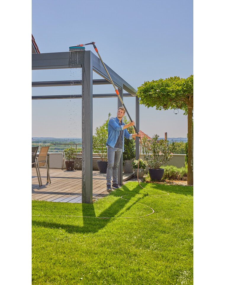 Le manche Flex Cleansystem de GARDENA est idéal pour le nettoyage humide des zones difficiles d'accès telles que les toits de terrasse.