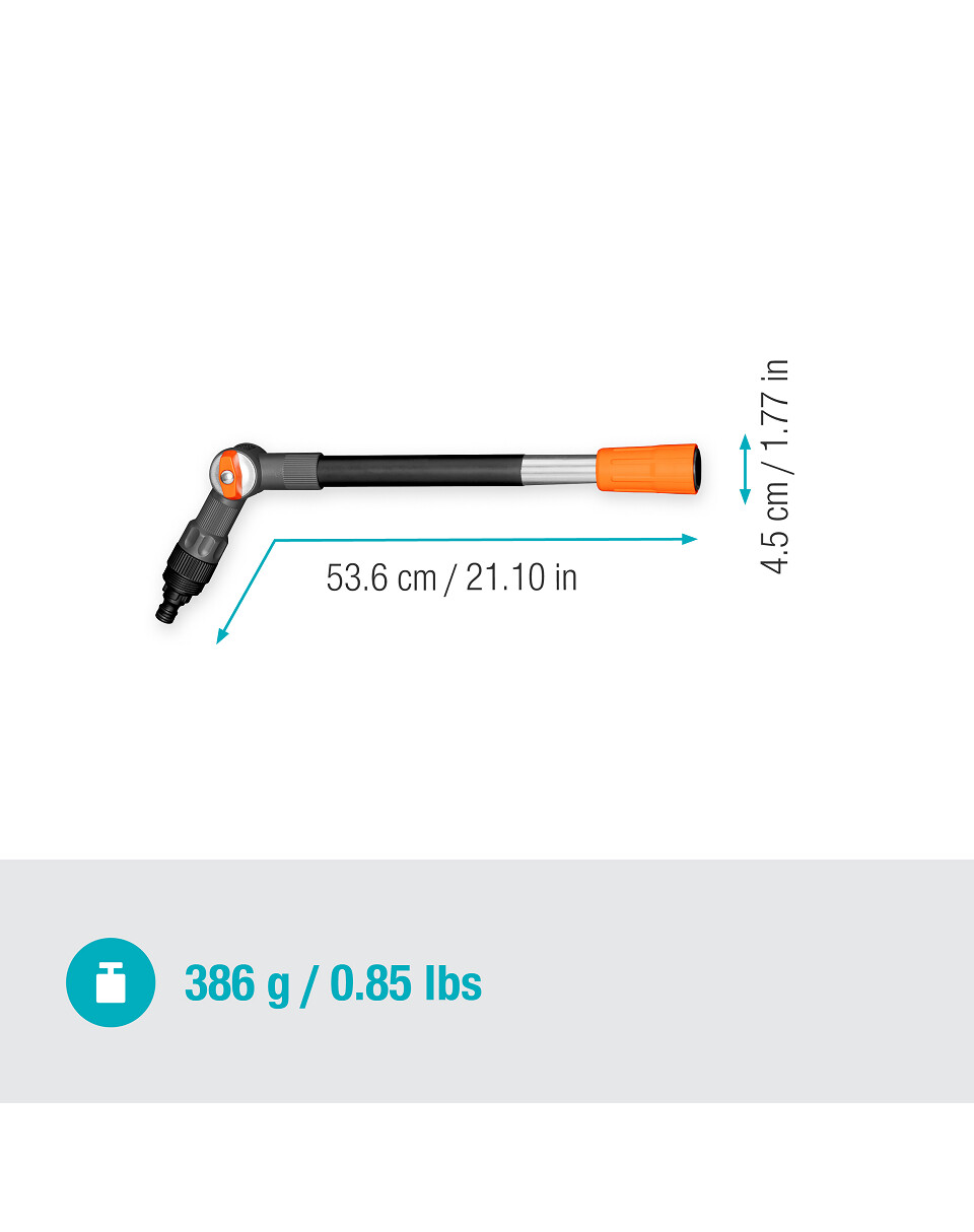 Le manche GARDENA Flex augmente le rayon d'action de 53 cm. Le nettoyage des surfaces horizontales plus élevées, telles que les terrasses ou les toits de garage, devient ainsi un jeu d'enfant. Cela signifie que vous pouvez utiliser le manche sans avoir besoin d'outils auxiliaires tels qu'une échelle. La poignée est fabriquée en aluminium durable de haute qualité et revêtue d'un revêtement agréable au toucher.