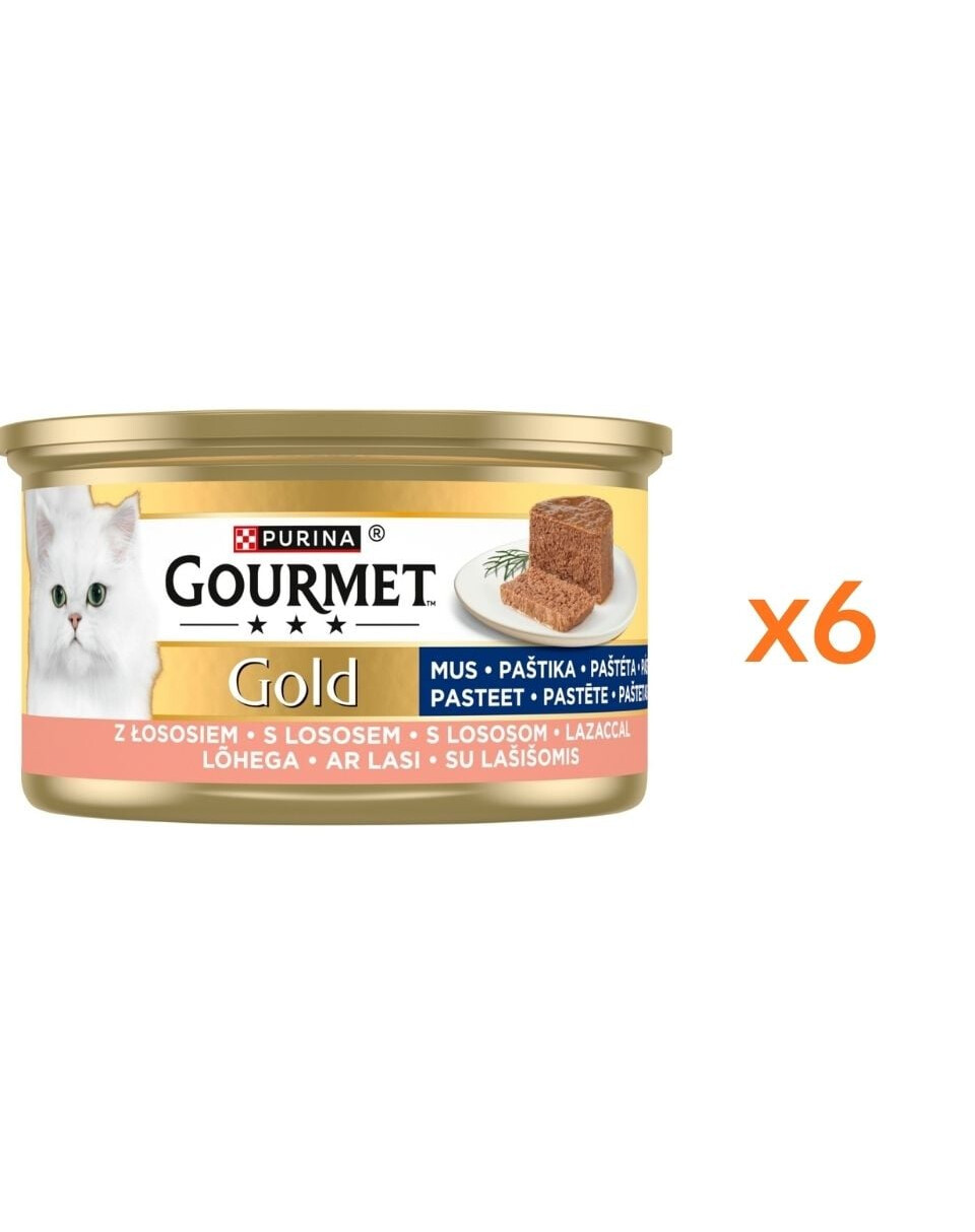 GOURMET Gold Mus au saumon est une nourriture humide complète pour chats adultes, se distinguant par sa texture délicate de mus et son goût raffiné de saumon.