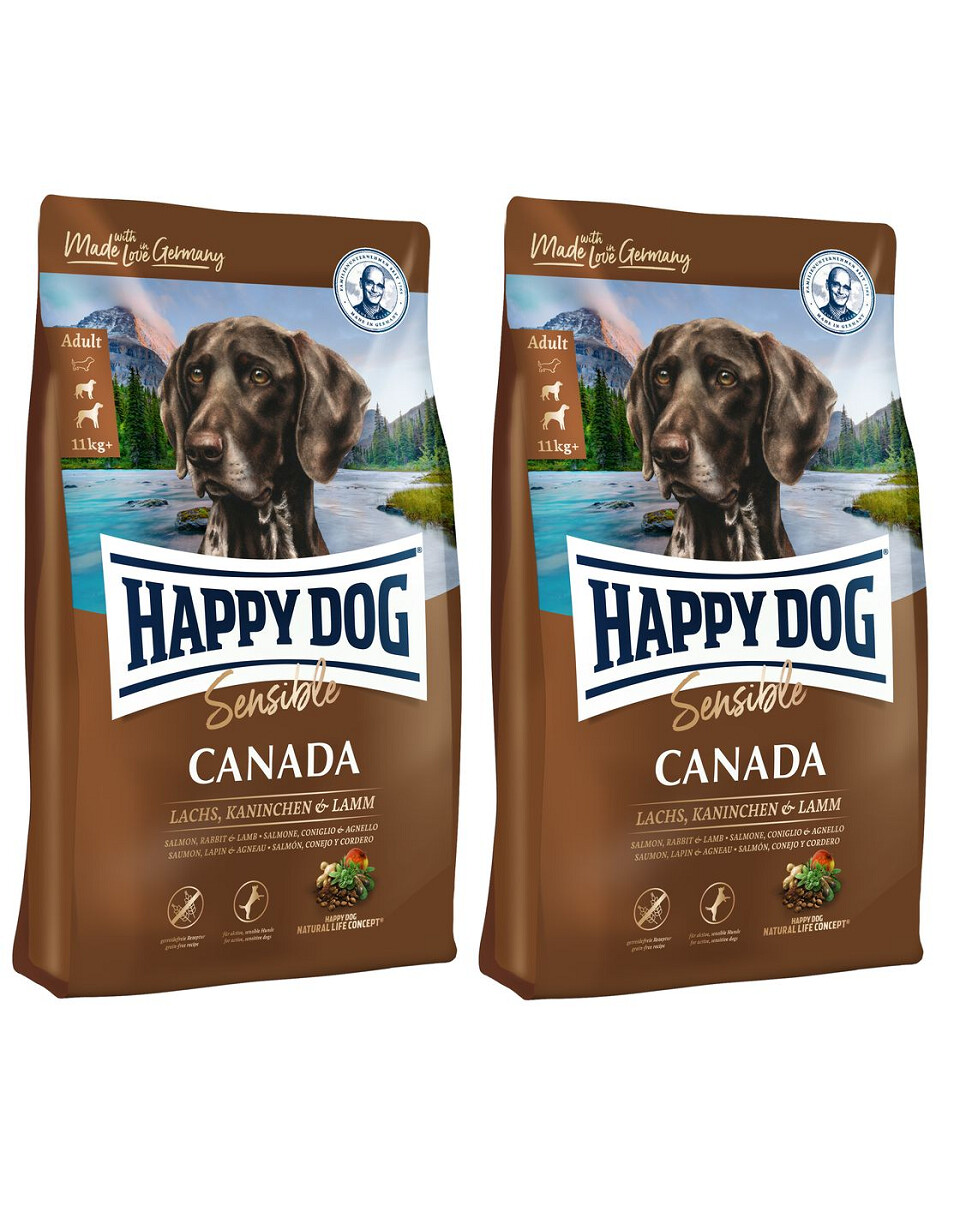 HAPPY DOG Supreme Canada, est une nourriture complète super premium exceptionnellement savoureuse, contenant du saumon tendre, du lapin et de l'agneau délicieux et des pommes de terre sans gluten.