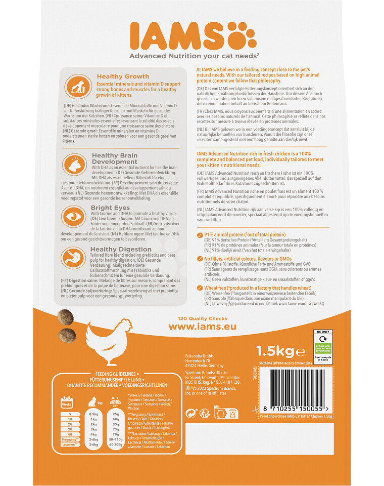 IAMS for Vitality Kitten Food est une spécialité alimentaire 100% complète et équilibrée qui a un goût délicieux et stimule le développement de votre chat.