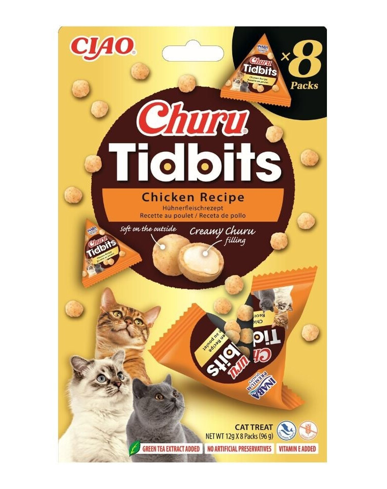 INABA Churu Tidbits sont des friandises uniques et douces alliant une enveloppe délicate à un cœur crémeux Churu. La version au poulet est une proposition pour les chats qui aiment les saveurs classiques et carnées avec un arôme prononcé.